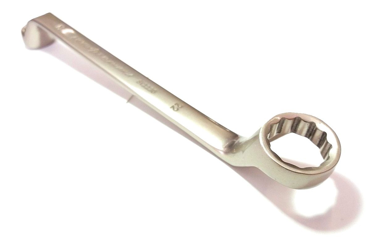 Накидной профиль, в отличии от рожкового, позволяет увеличить прилагаемое к крепежу усилие, с минимальным риском повреждения граней. Смещение профиля в 45º от продольной оси коленчатого ключа делает работы в ограниченном пространстве более удобными. Никелирование обеспечивает дополнительную антикоррозионную стойкость.