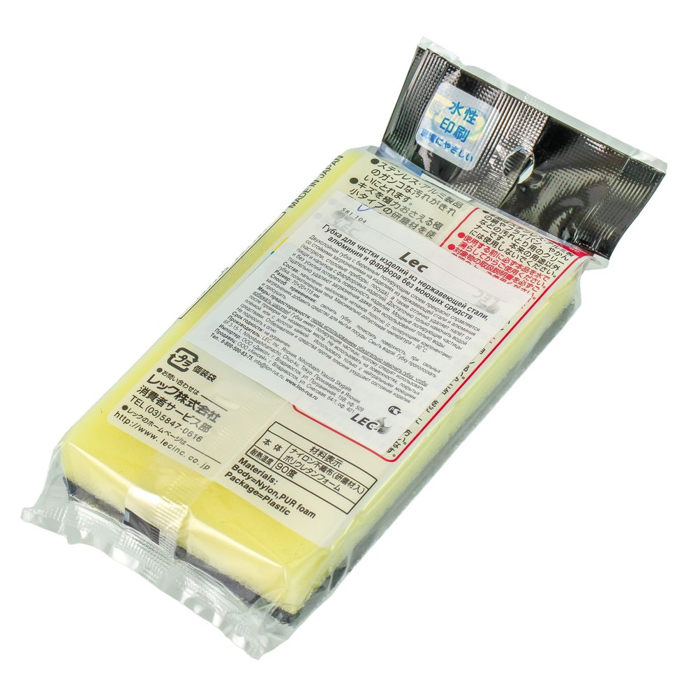 Япония Бренд: LEC. Двухслойная губка с бережным полирующим слоем прекрасно справляется со стойкими загрязнениями на изделиях из нержавеющей стали и алюминия (кастрюли, столовые приборы, посуда), а также отлично удаляет налет от пищи и напитков с фарфоровых изделий. Достаточно только намочить водой и без усилий потереть поверхность изделия. Мощные полирующие частицы тщательно удаляют загрязнения даже при использовании только воды. Произведено в Японии. Состав: напыление: нейлоновое нетканое полотно (с полирующими компонентами); губка: полиэтиленовая пена. Максимально допустимая температура – 90 С.